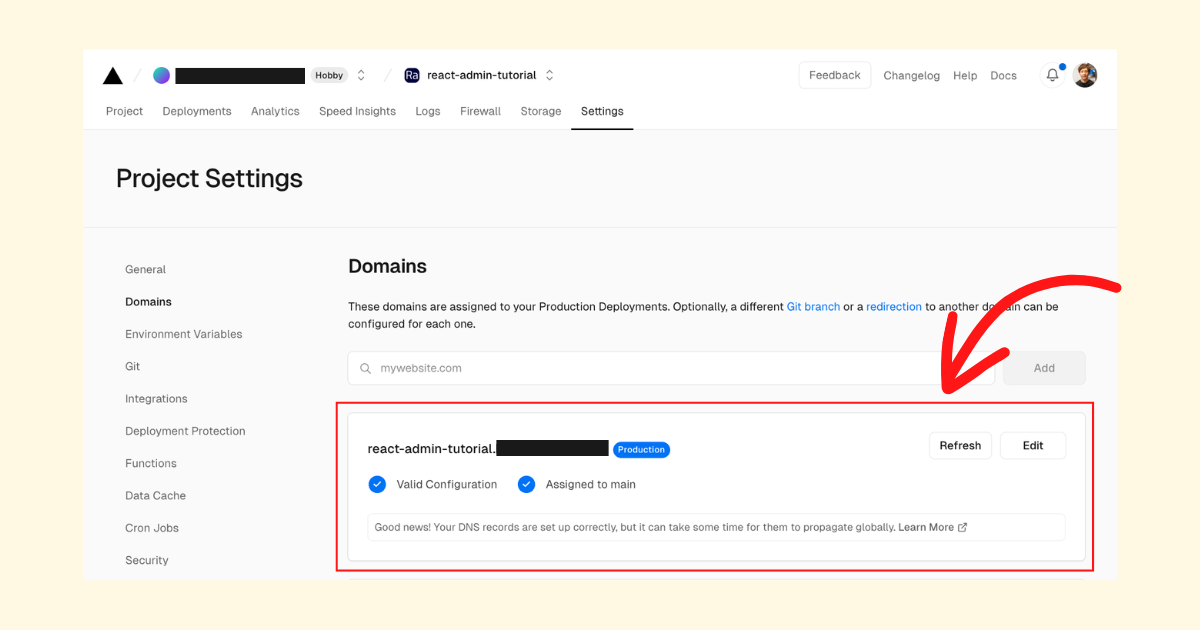 resource "vercel_project_domain" "react_admin_tutorial" { project_id = vercel_project.react_admin_tutorial.id domain = "react-admin-tutorial.xxxxx.com" }