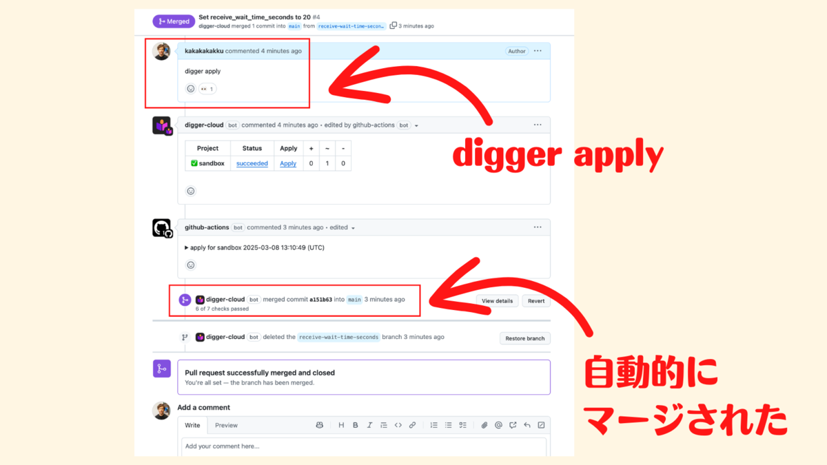 次に適当なプルリクエストを作って,terraform plan 結果を確認したら digger apply コマンドを実行する.すると terraform apply 後に digger-cloud bot によって自動的にプルリクエストがマージされた❗️